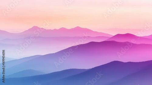 Mountaintop sunset fog concept. Abstract landscape with soft pastel mountain silhouettes at sunrise.