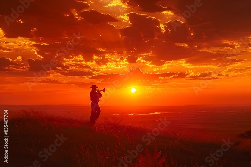bugler, tap, hilltop, sunset, silhouette, windswept, landscape, mournful, note, veteran, military, remembrance, solitude, tribute, nature, sky, horizon, beautiful, scenic, view, twilight, memorial, respect, solemn, tranquil, sun, dusk