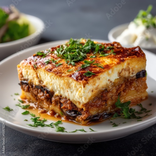 aubergine, ground meat, béchamel, parsley, garnish, white plate, side dish, salad, yogurt, sauce, layer, baked, oven, food photography, closeup, square, brown, white, green, grey background, dinner, lunch, meal, vegetable, dish, serving, portion, cooked, culinary, delicious, tasty, appetising, traditional, receipe, main course, meat, ground beef, creamy, olive oil, seasoning, fresh, herb, grated cheese, golden brown