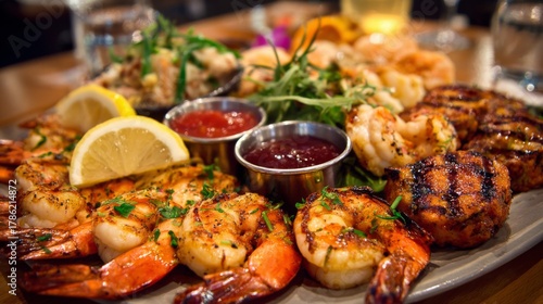 seafood, platter, shrimp, lobster, grill, lemon, garnish, herb, dipping, sauce, dinner, meal, cookery, fresh, cooked, eatery, colourful, tasty, favor, culinary, elegant, feast, presentation, wooden, table, epicure, plate, dining, rich, aroma, indulgent, vibrant, succulent, dish, flavorful, healthy, nourishment, satisfying, delicious, enjoyment