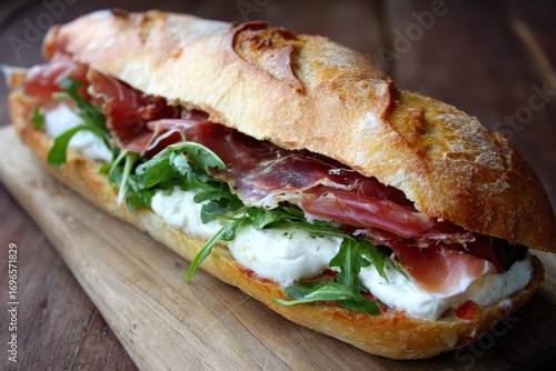Mozzarella And Prosciutto Sandwich. Fresh Homemade Baguette Sandwich with Healthy Ingredients