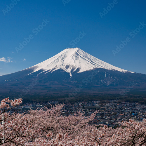 Mt. Fuji in the spring time with cherry blossoms at kawaguchiko Fujiyoshida, Japan.