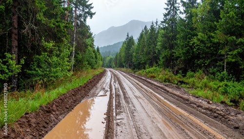 forest, road, mud, nature, landscape, travel, dirt, path, tree, puddle, outdoors, journey, scenery, calmness, adventure, greenery, wet, environment, wilderness, rural, mist, cloudy, exploration, unpaved, scenic, dirt road, countryside, weather, terrain, isolation, fog, drive, natural, summer, peace, vibrant, environmentally friendly, natural beauty, calm, serene, water, vegetation, footpath, hiking, wood, mountain