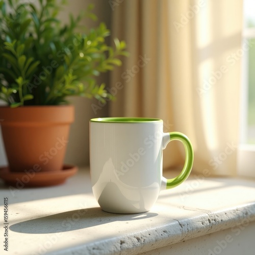 mug, white, green, handle, trim, window sill, plant, potted, indoor, cup, beverage, drink, table, shadow, sunlight, window, curtain, room, home, interior, still, life, ceramic, object, surface, light, day, closeup, view, angle, flora, vessel, container, decoration, design, style, modern, minimal, simple, clean, bright, fresh, calm, peaceful, serene