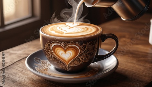 Mug of hot coffee with a beautiful heart design created from pouring milk and steam rising