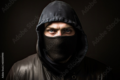 Mugshot of burglar wearing a balaclava closeup on black dark background. Portrait of thief burglar in a black hoodie and mask. Generative AI
