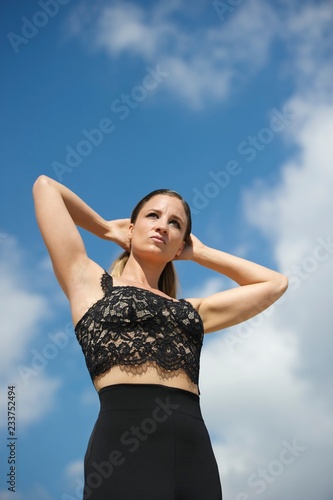 woman, young, heaven, beauty, lovely, portrait, summer, happy, fashion, blue, fitness, woman, people, person, hair, body, model, dress, health, healthy, smile, nature, outdoors, hair removal, hair salon, beauty