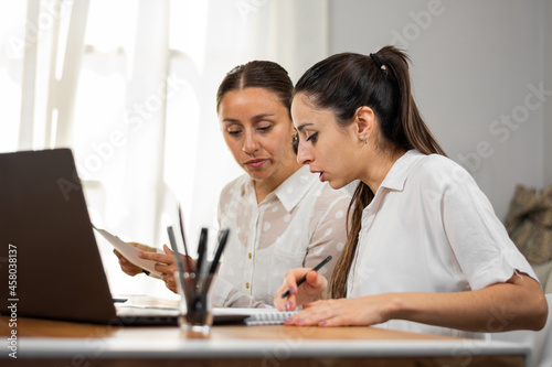Mujeres de negocio conversan en la oficina mientras trabajan.
