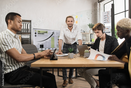 Multi ethnic company workers sitting at desk with modern devices, preparing financial report and listening speech of their young male boss. Concept of technology and cooperation.