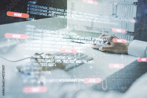 Multi exposure of abstract creative coding sketch and hands typing on computer keyboard on background, artificial intelligence and neural networks concept