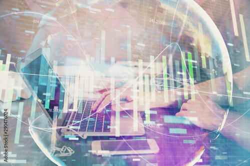 Multi exposure of businessman working on laptop on background. International business hologram in front. Concept of success.