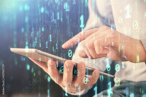 Multi exposure of man's hand holding and using a digital device and data theme drawing. Innovation concept.