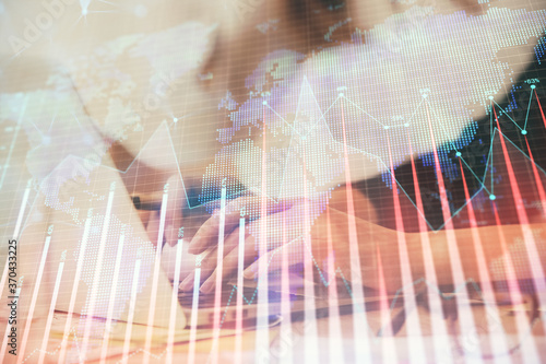 Multi exposure of woman hands typing on computer and financial graph hologram drawing. Stock market analysis concept.