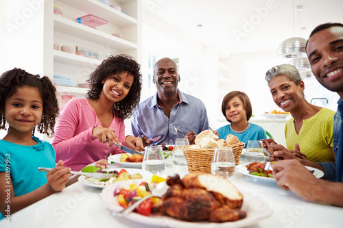 african american, eating, meal, food, together, indoor, home, sitting, table, enjoyment, relaxed, relaxing, happy, smiling, mother, father, daughter, eltern, grandmother, granddaughter, grandparent, horizontal, talking, portrait, family, woman, black, people, person, 20s, 20s, woman, female, man, male, man, girl, boy, children, children, mother, father, 50s, 50s
