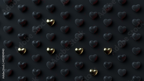 Multicolored Heart background. Valentine Wallpaper with Black and Gold love hearts. 3D Render