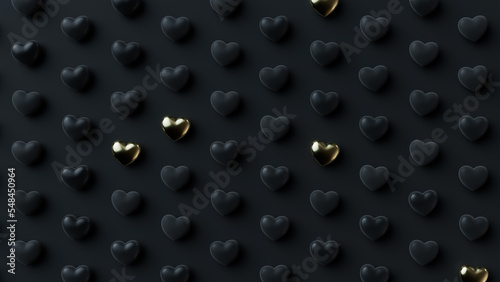 Multicolored Heart background. Valentine Wallpaper with Black and Gold love hearts. 3D Render