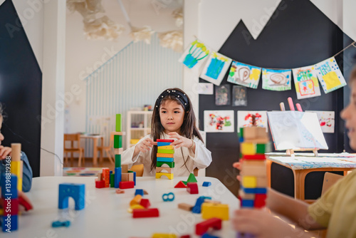 Multicultural group of young children building with colorful blocks in a creative preschool classroom, enhancing teamwork, focus, and motor skills during a fun group activity.