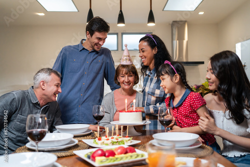 Multi-ethnic big family having birthday party for senior grandmother.