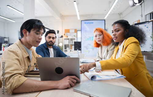 Multi-ethnic business team in office meeting, reviewing documents and brainstorming innovative ideas for a new business venture and strategy.