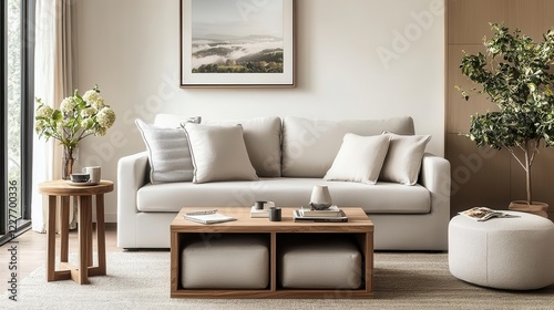 Multifunctional living room with a sofa bed, nesting tables, and hidden storage ottomans for compact living