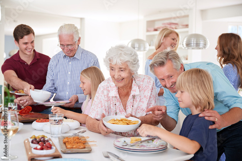 Multi-Generation Family And Friends Eating Food In Kitchen At Celebration Party