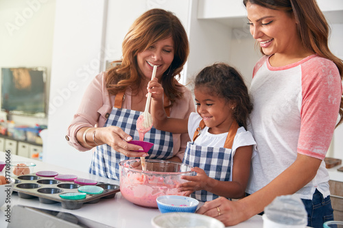 family, baking, making, cake, indoor, home, kitchen, grandmother, granddaughter, mother, daughter, mixing, ingredient, cupcake, teaching, learning, helping, homemade, happy, smiling, laughing, fun, together, messy, enjoyment, woman, woman, female, girl, children, children, three people, people, person, hispanic, 50s, 50s, 20s, 20s, horizontal, grandparent, grandchild, breaking, cracking, egg, receipe