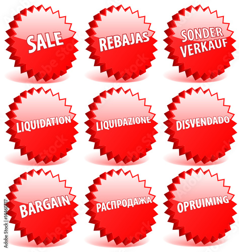multilingual, sale, starburst, badge, international, vector, collection, promotional, sticker, set, language, global, worldwide, marketing, advertising, business, retail, discount, offer, special, red, gradient, burst, sunburst, explosion, shape, commercial, promotion, clearance, bargain, liquidation, spanish, german, italian, russian, dutch, english, french, european, text, typography, label, tags, seal, stamp, crimson, attention