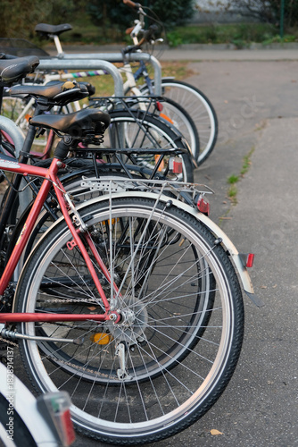 Multiple bicycles are aligned in a row on the pavement. A red bicycle with a rear wheel, saddle, and metal rack is prominent in the foreground. Additional bicycles extend deeper into the frame.