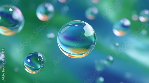 Multiple Colorful Droplets Bouncing Across a Vibrant Abstract Green and Blue Background