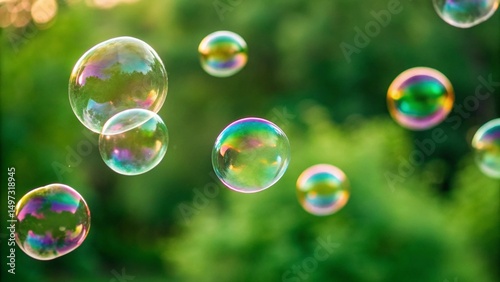 Multiple iridescent soap bubbles float gracefully against a soft, blurred green background, creating a whimsical and dreamy atmosphere