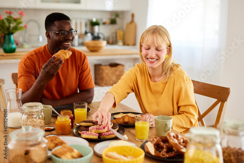 Multiracial couple enjoying breakfast together at home
