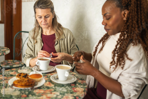 beverage, blond, breakfast, cafeteria, cake, carb, hot drink, coffee cup, curly hair, delicious, diet, eat, eating, flowery, friends, friendship, inclusion, indoor, meet, multiracial, nourishment, pastry, patterned, sitting, snack, style, sugar, sweet, table, talking, tea, 2