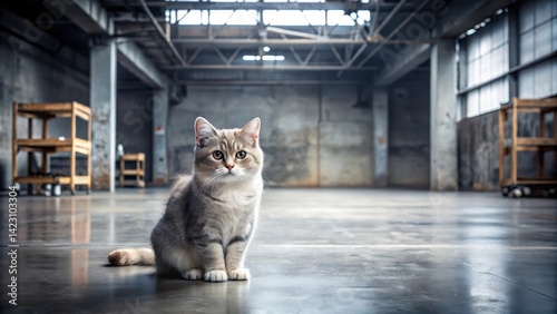 Munchkin cat sitting on a cold grey concrete floor surrounded by industrial elements