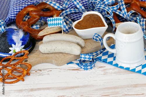 sausage, beer, pretzel, oktoberfest, pitcher, glasses, streamer, decoration, decoration, pretzel, sausage, mustard, beer garden, breakfast, speciality, calf, rhomb, banner, flag, hat, bavaria, bavarian, bavaria, munich, german, food, tradition, blue, party, napkin