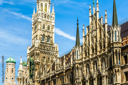 munich, city hall, ancient, architecture, bavaria, church, city, clear sky, clock, europa, facades, flag, german, history, historical building, new, nobody, old, ornate, outdoors, past, sky, square, statue, stucco, tour tourism, tower, town, travel, virgin mary, building, city hall, day, famous, hall, historic, landmark, sunlight