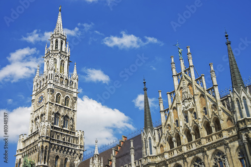 munich, german, skyline, sightseeing, city hall, square, city, summer, holiday maker, sky, blue, cloud, architecture, landmark, bavaria, travel, city hall, tower, flag, german, sunshine, church steeple, clock-tower, decoration, sculpture