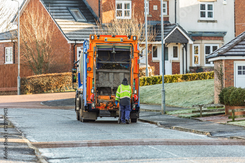 municipal, council, denied, truck, lorry, vehicle, men at work, operative, man, person, waste, collecting, collection, residential, urban, recycling, wheelie, bin, can, trash, suburban, street, road, pavement, sidewalk, garbage, waste management, daytime, house, city, britain