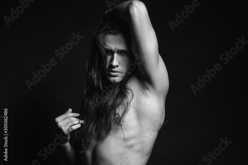 Muscle strong beautiful stripped male model portrait on isolated font background with shadow