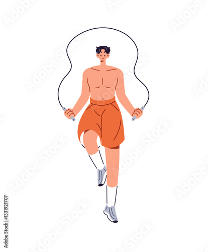 Muscular boy does cardio training, warms up with skipping rope. Happy athlete jumps, does exercise with leaps, hops during sports workout. Flat isolated vector illustration on white background