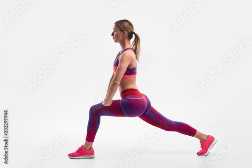 woman, lunge, exercise, physical exercise, fit, sport, young, healthy, fitness, stretch, female, leg, training, wellness, well-being, vitality, slim, muscular, strength, power, lady, physical, effort, motivation, determination, stamina, endurance, bra, leggings, sneaker, focused, concentrated, full-length, full body, white background, horizontal, studio shot, half face, isolated, copy space