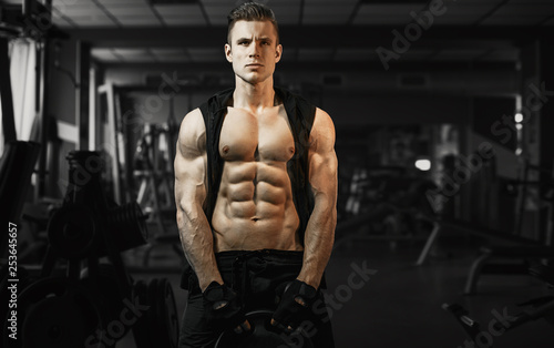 Muscular model sports young man exercising in gym with dumbbell. Portrait of sporty healthy strong muscle. Fitness trainer. Sport workout bodybuilding motivation concept. Sexy torso.