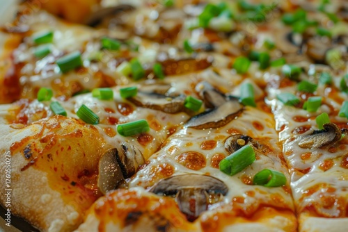 pizza, mushroom, green onion, cheese, crust, savoury, aromatic, dining, cosy, casual attire, delicious, topping, baked, epicure, meal, comfort, homemade, fresh, oven, culinary, italian, cookery, favor, rich, inviting, rustic, food, slice, appetising, edible, herb, pepper, garnish, texture, mozzarella, delightful, crusty, snack, golden brown, ai, beautiful, incredible, gorgeous
