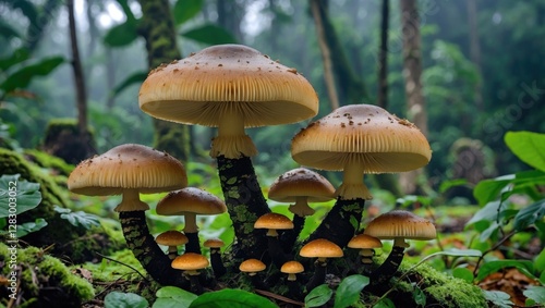 Mushroom cluster in a tropical forest with varying sizes and shapes against lush green foliage and atmospheric mist