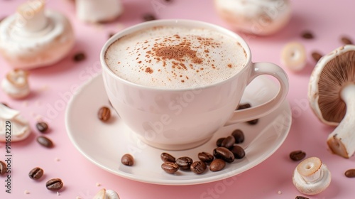 mushroom, hot drink, cup, ceramic, alternative, champignon, caffeine, creamy, pastel, saucer, beverage, drink, pink, coffee bean, fresh, mushroom, speckled, natural, rustic, earthy, epicure, specialty, brewed, aromatic, wellness, health, trendy, unique, concept, invigorating, relaxing, cosy, organic, nourishment, warm, favor, culinary, minimalist