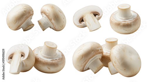 Mushrooms in various cuts and arrangements in soft natural lighting on white background for culinary use