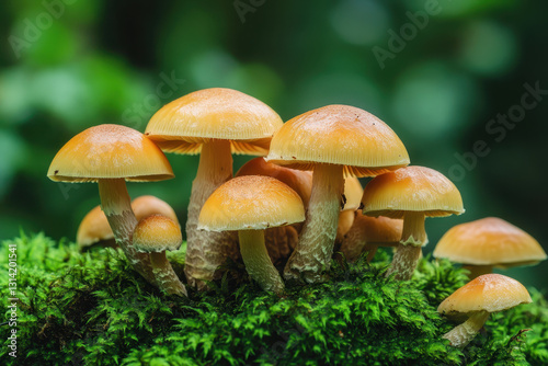 Mushrooms scattered on lush green moss in a serene forest setting, with soft light filtering through tree branches.