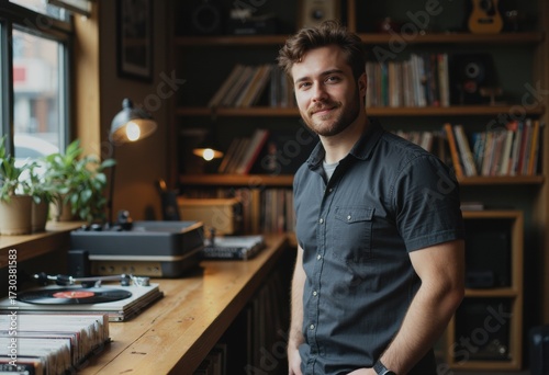 music, store, manager, area, vinyl, record, turntable, confident, ambience, passion, inviting, atmosphere, client, retail, shop, sound, audio, collection, entertainment, lifestyle, male, man, professional, casual attire, friendly, service, display, instrument, culture, community, vintage, design, decor, hobby, leisure, life events, enjoyment, creativity, art, business, engagement, interaction