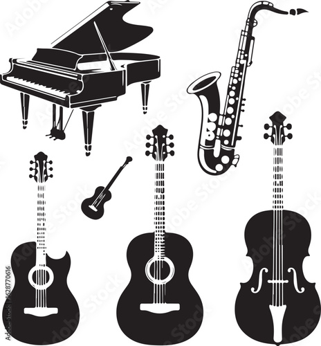 musical instrument, piano, grand piano, saxophone, guitar, acoustic guitar, fiddle, cello, ukulele, music, instrument, acoustic, musical, orchestra, symphony, harmony, melody, classical music, jazz, band, performance, concert, black-and-white, vector, illustration, clip art, isolated, silhouette, sound, entertainment, art, drawing, design, artwork, vintage, retro
