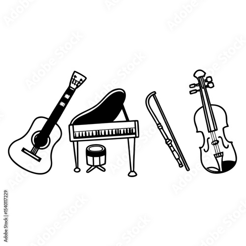 musical instrument, guitar, piano, fiddle, string instrument, music, illustration, vector, icon, graphic, design, art, melody, song, classical, jazz, band, orchestra, performance, entertainment, artistic, outline, drawing, digital artwork, clip art, line art, isolated, black-and-white, logotype, symbol, signs, design element, concert, culture, musical, graphic design, simple, acoustic guitar