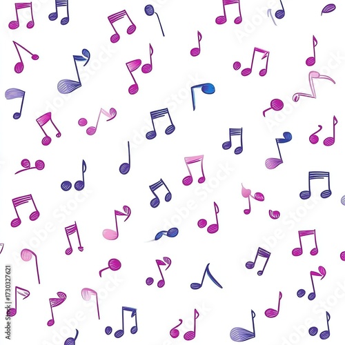 Musical notes in purple shade floating in air white background.